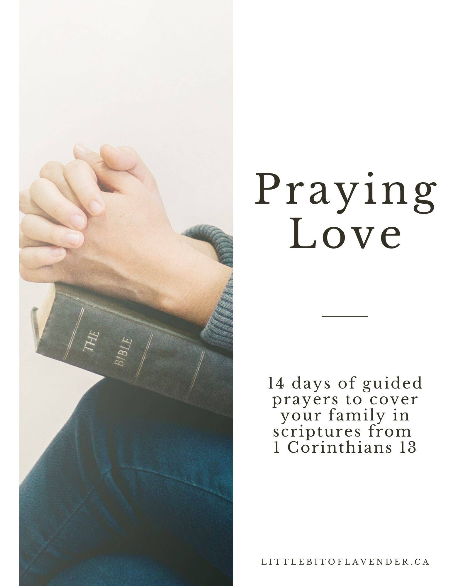 The 14-Day Praying Love Challenge gives you guided prayers to pray over your family, plus simple actions to live out biblical love throughout your day. Based on 1 Corinthians 13, you'll pray for patience, kindness, forgiveness, and more—with practical application for real family life.